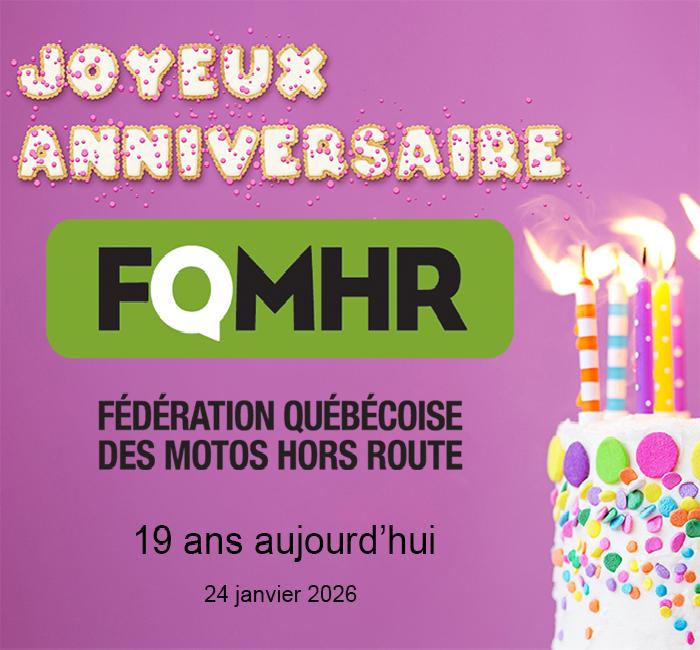 Aujourd’hui, le 24 janvier 2026, la Fédération Québécoise des Motos Hors Route (FQMHR) fête ses 19 ans.